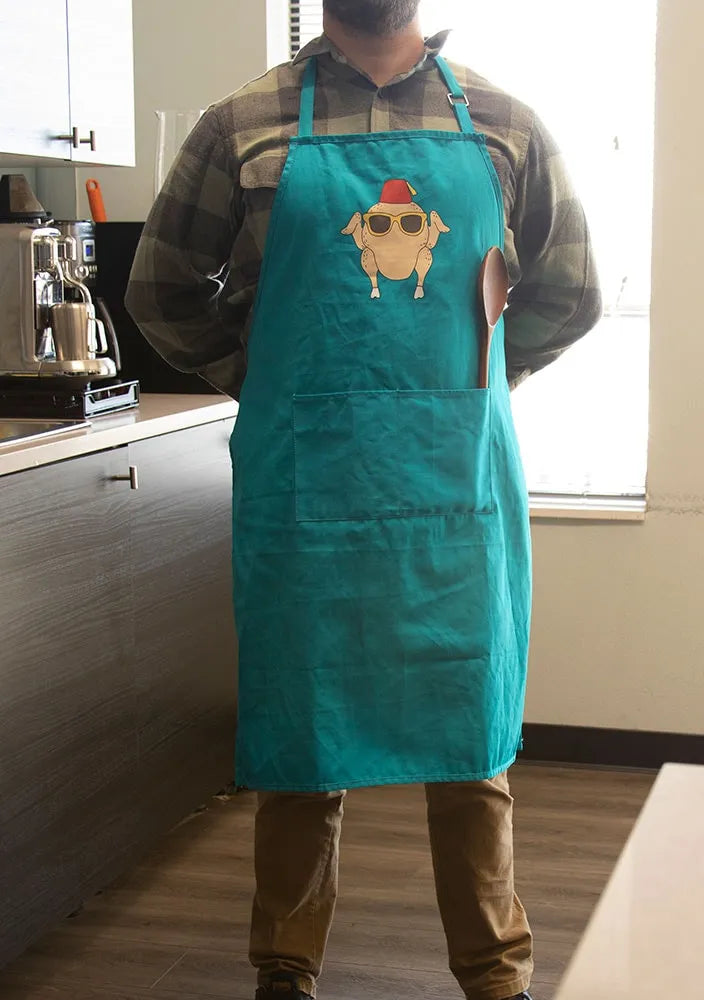 Inclui Avental Exclusivo de Peru. Não disponível em nenhum outro lugar, este avental de alta qualidade possui alças ajustáveis, um grande bolso frontal e o icônico peru de feriado da Monica recriado em gloriosas cores vivas.