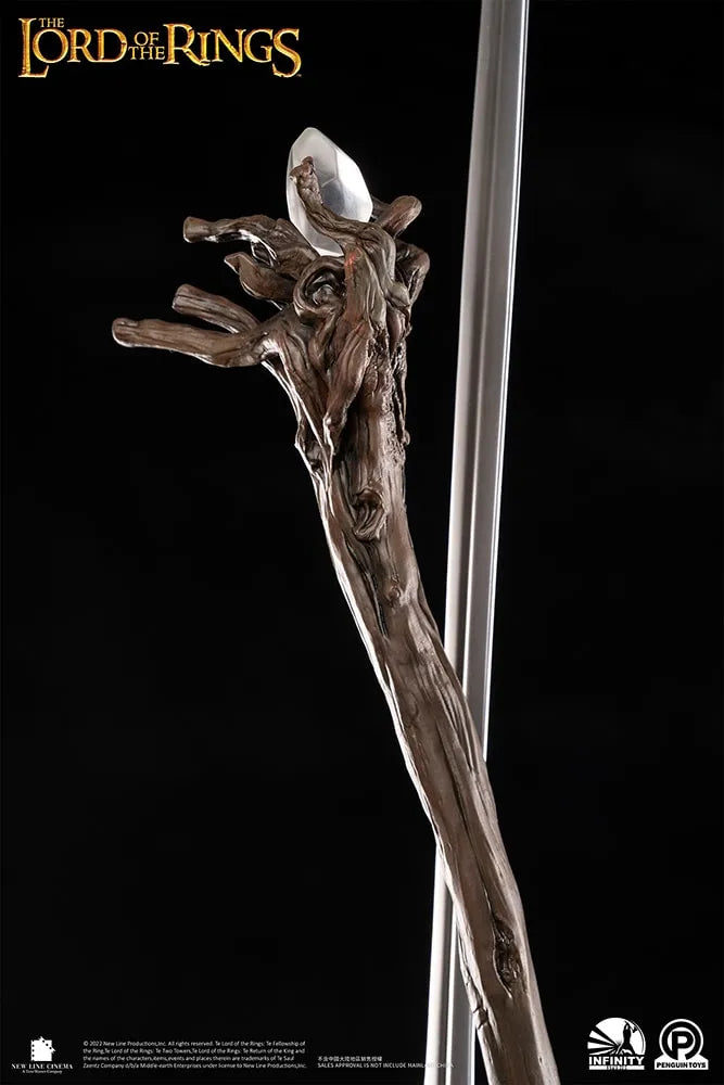 Esta estátua possui uma altura impressionante de aproximadamente 156 cm, desde a base até a ponta da espada Glamdring, e apresenta uma cabeça moldada em PVC com cabelo esculpido de forma meticulosa e detalhada.