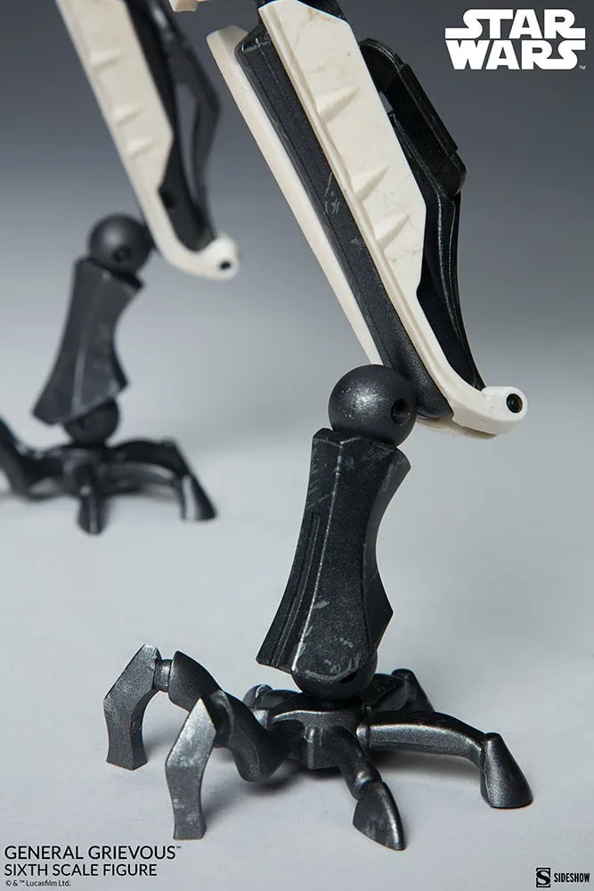 Projetada com atenção meticulosa aos detalhes, a Figura do General Grievous em Escala 1/6 é totalmente articulada para alcançar posturas dinâmicas e intimidadoras, recriando todos os seus momentos favoritos de vilania da saga Star Wars. Da cabeça aos pés, o Comandante Supremo da Confederação mede 40 cm de altura, com um corpo cibernético detalhado, pés com garras e membros com múltiplas articulações. Grievous também inclui uma capa de tecido cinza removível com um forro vermelho interno que possui bolsos para guardar sabres de luz roubados.