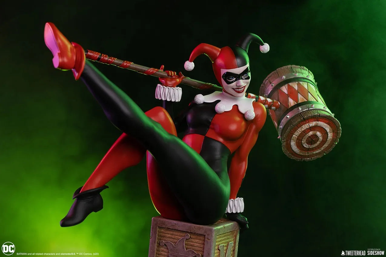 Harley Quinn está recém-saída do Asilo Arkham e pronta para causar caos mais uma vez em forma de estátua encantadora! Esta Princesa Palhaça do Crime empunha seu característico martelo gigante enquanto faz uma pose sedutora, com os pés pontudos chutando alto no céu de Gotham. Ela mede 58 cm da base até a ponta do pé levantado, e 46 cm de largura do pé até a ponta do martelo.