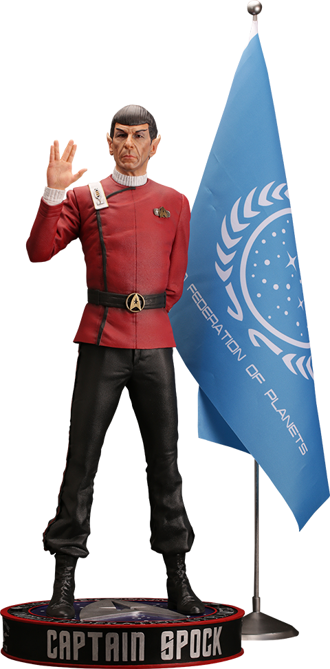 Leonard Nimoy, posando na saudação oficial da Frota Estelar, mede mais de 63 cm e é apresentado em um traje de capitão esculpido com detalhes autênticos. Esta figura de Star Trek captura o sentimento nobre e o caráter de Spock e é acompanhada pela bandeira da Federação Unida dos Planetas.