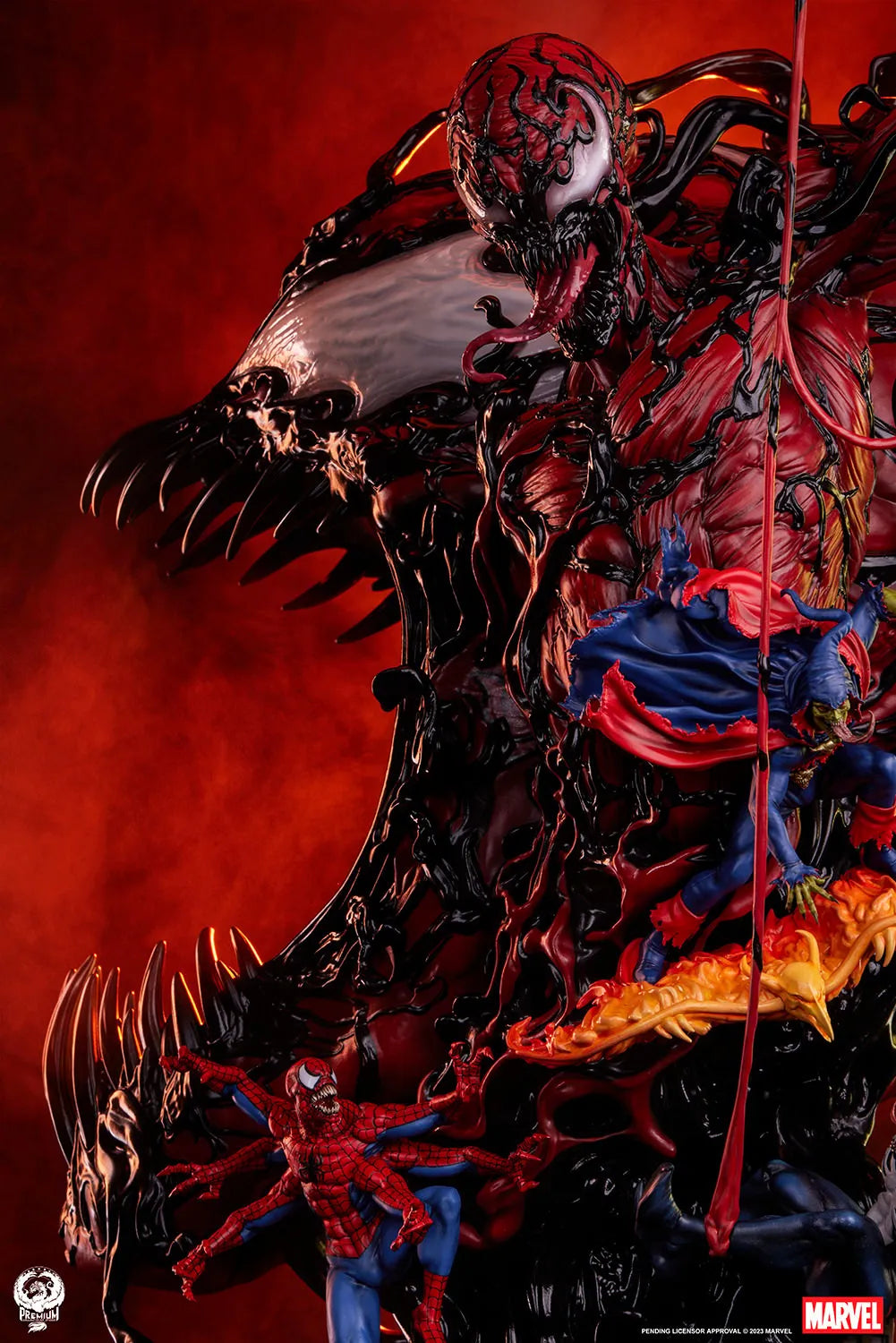 Este diorama totalmente esculpido destaca o sedento por sangue gerado do Venom, Carnificina, hospedado pelo criminoso violento Cletus Kasady. O monstruoso Carnificina domina este colecionável altamente criativo, envolvendo uma seleção improvável de heróis e vilões em pequena escala em sua forma amorfa. Personagens como Homem-Aranha, Manto, Venom, Gata Negra, Shriek, Demogoblin e o doppelgänger do Homem-Aranha de seis braços se enfrentam acima da cidade coberta pelo simbionte abaixo.