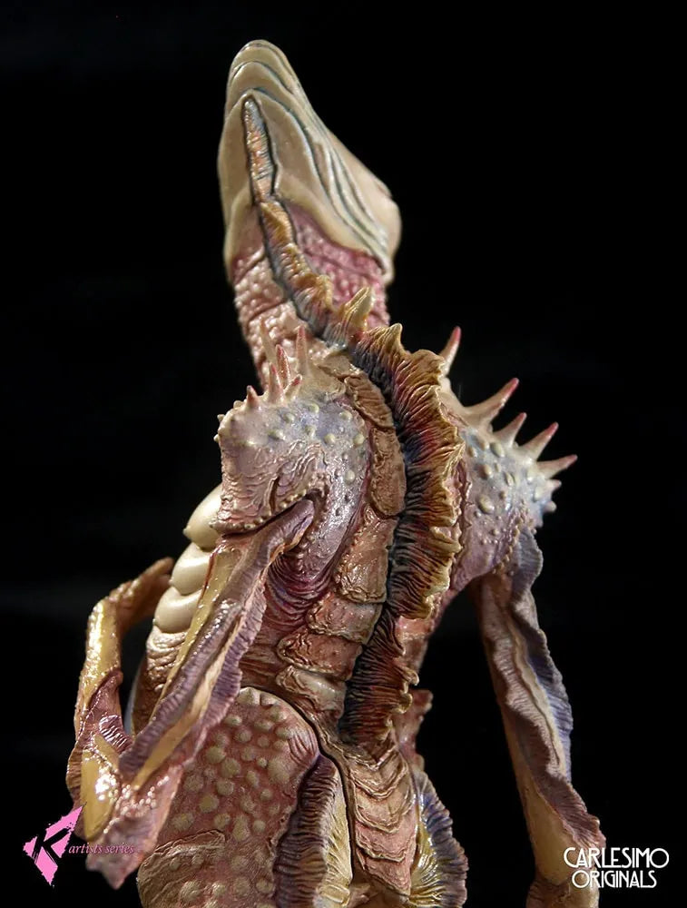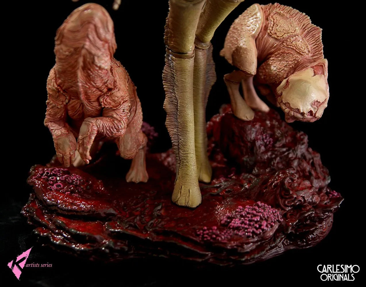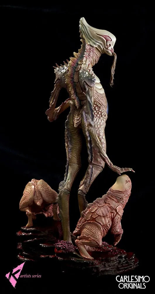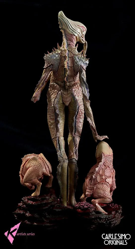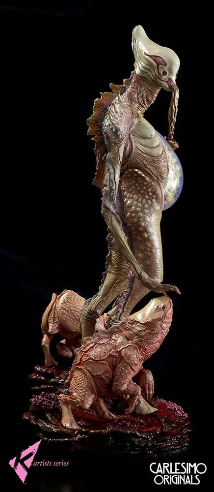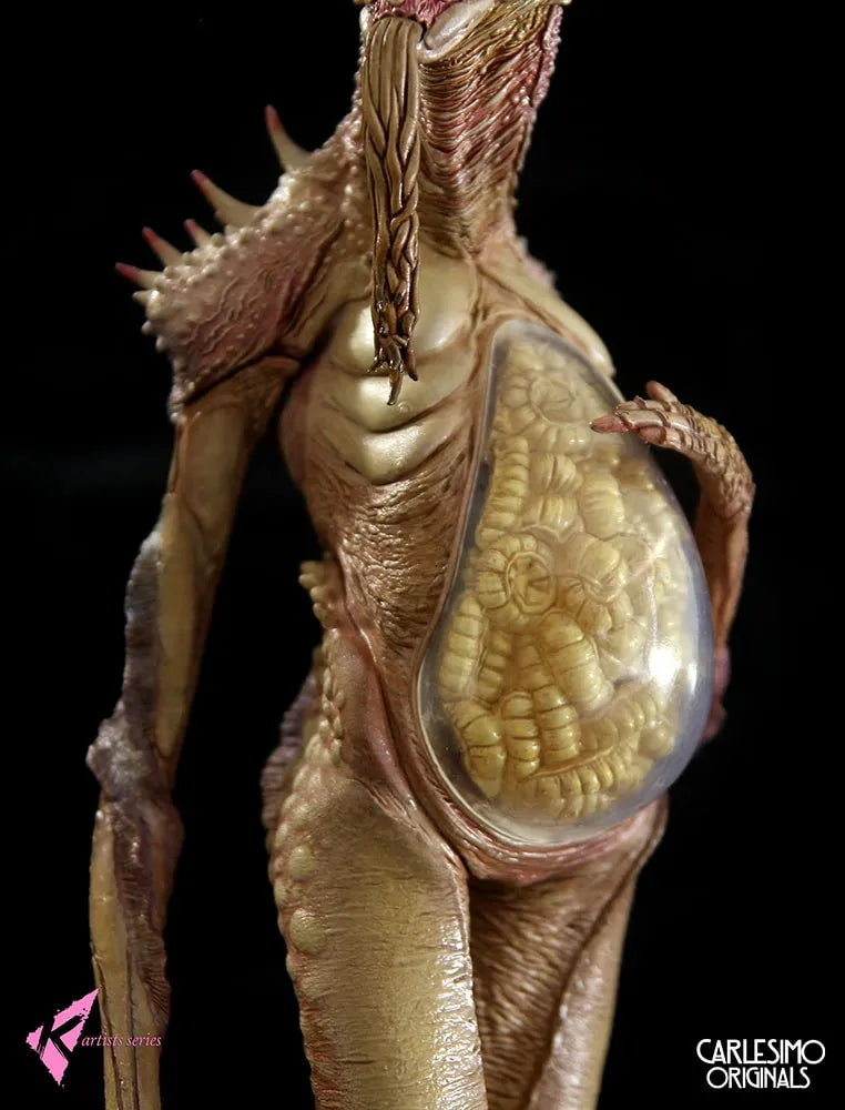 O diorama retrata um mundo alienígena onde uma criatura mãe caminha com seus dois filhotes. A escultura extremamente detalhada e a estátua pintada de forma intrincada têm uma base pequena, mas repleta de detalhes imensos. Contendo partes de resina transparente que mostram o ciclo de vida frágil e os embriões dentro da 'Mãe' grávida. Não perca a chance de adicionar essa bela criatura à sua coleção!