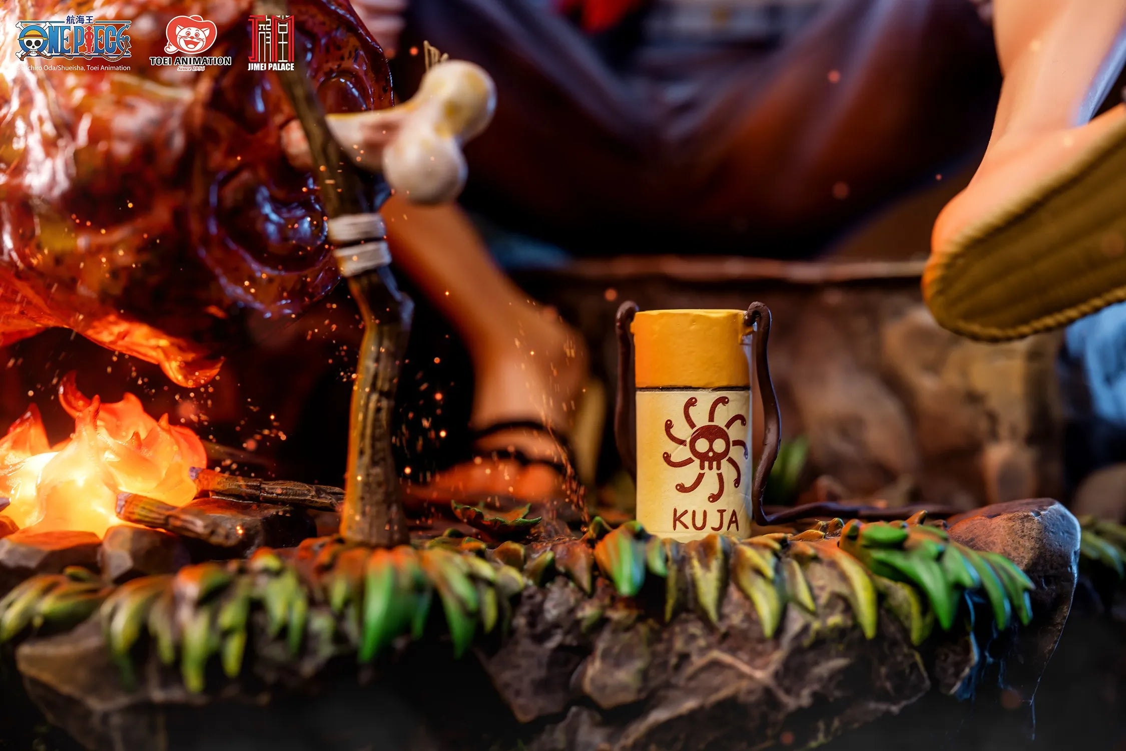 Para tornar Luffy mais forte, Rayleigh realizou um treinamento rigoroso com ele. Alguns desses treinamentos incluíam ser espancado, então ele teve que enfrentar feras de todos os lados. Esta estátua mostra Luffy comendo churrasco, assim como na série de anime, mas ele não pode baixar a guarda, pois deve estar sempre atento às mudanças no ambiente ao redor. Por exemplo, enquanto Luffy devora seu churrasco, Rayleigh de repente o acerta de surpresa. Rayleigh é mais como um mentor de vida para Luffy. Enquanto o ensinava a ver e ouvir de forma dominante, também lhe ensinou como enfrentar as dificuldades da vida.