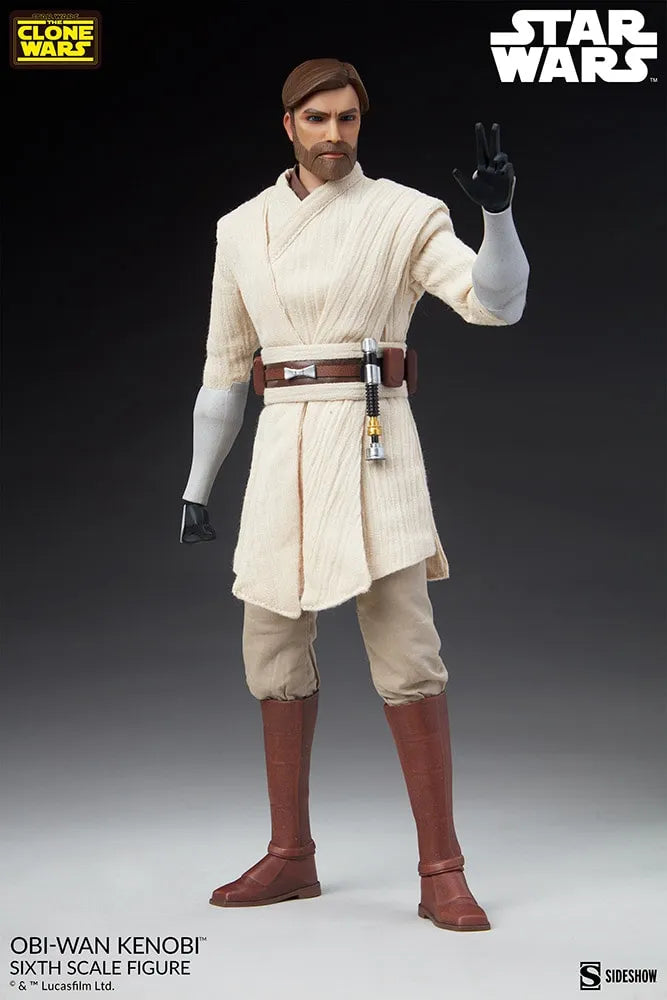 A Figura de Escala 1/6 do Obi-Wan Kenobi inclui várias mãos estilizadas e acessórios intercambiáveis para oferecer aos colecionadores uma ampla gama de opções de exibição para o general Jedi. Obi-Wan Kenobi vem com quatro pares de mãos estilizadas, incluindo um par de mãos de agarre, um par de mãos neutras, um par de mãos de força e um par de punhos para uma grande variedade de gestos e combinações de poses. Além disso, ele vem com um cabo de sabre de luz e um sabre de luz com sua lâmina azul afilada liberada para ação de batalha. Finalmente, Obi-Wan inclui um acessório de holoprojetor com um holograma esculpido do Comandante Cody™ para comunicação com o leal Clone Trooper.