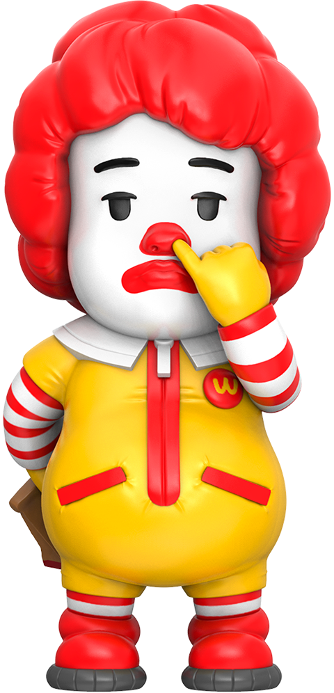 Começando a série com O Palhaço, instantaneamente reconhecível com seu afro vermelho e macacão amarelo. Exigente com comida, mas nem tanto com higiene, O Palhaço cutuca o nariz com o dedo mindinho - os únicos verdes que ele busca de bom grado. O que é isso atrás das costas dele?! Não são vegetais, com certeza.