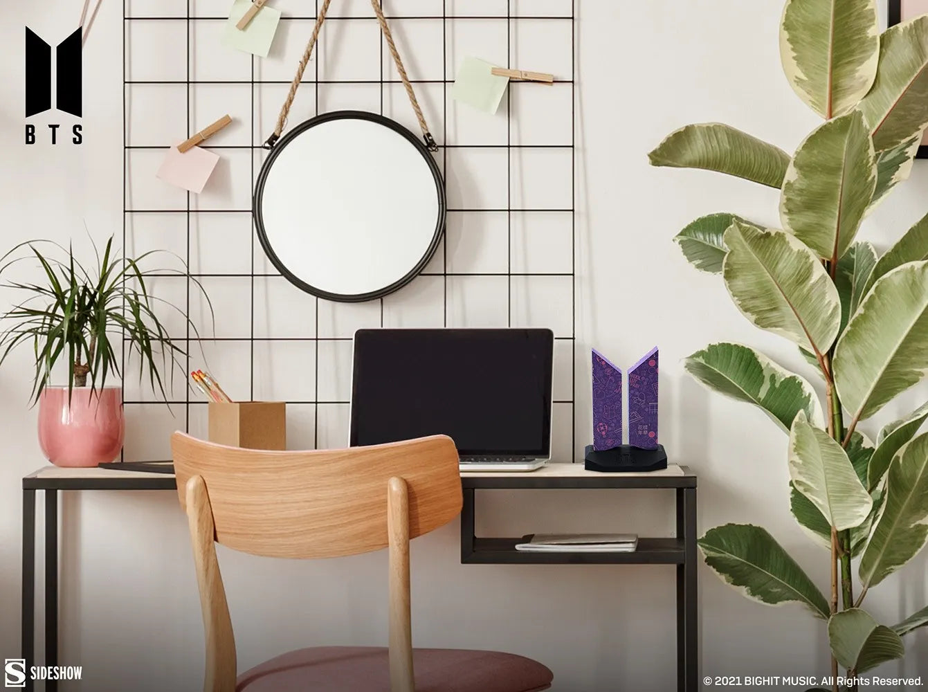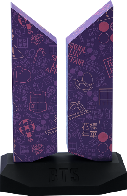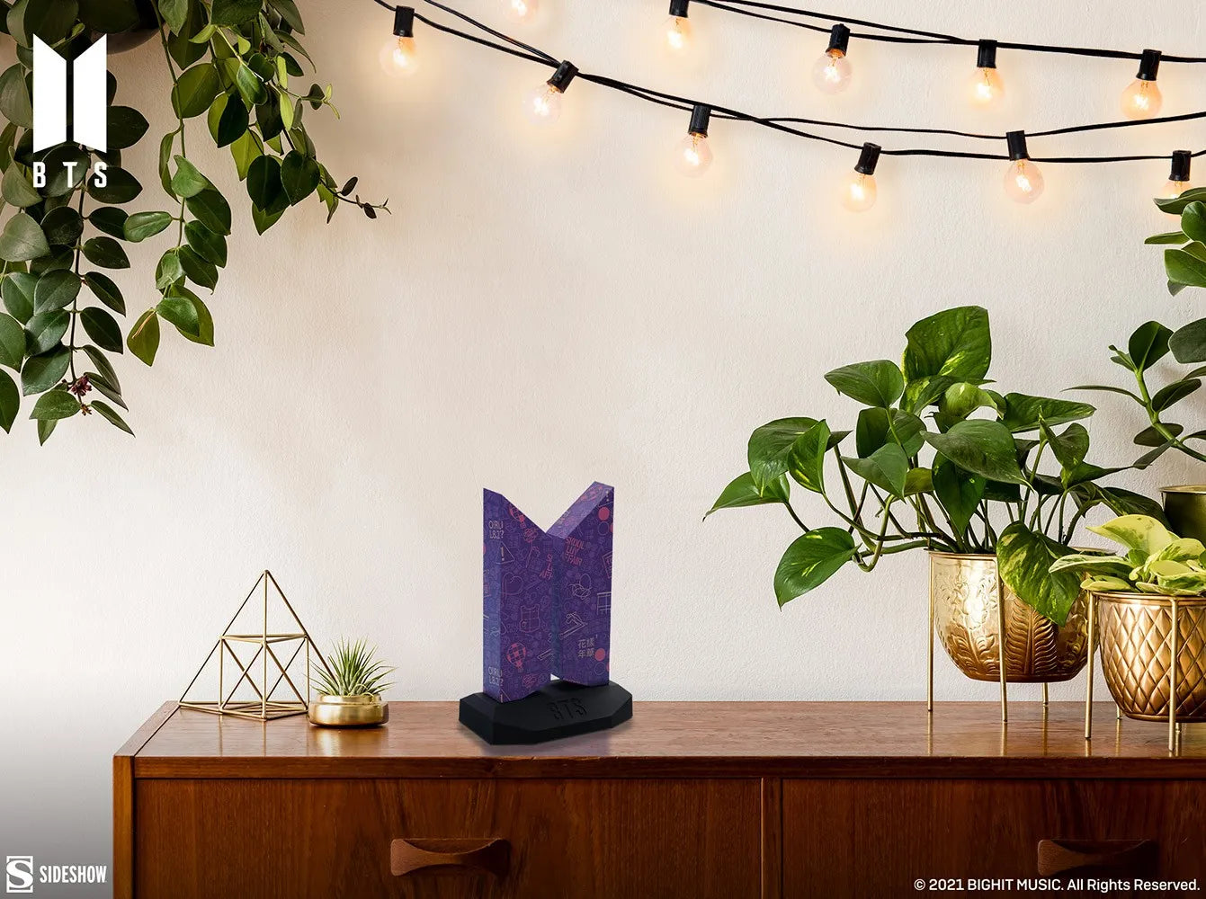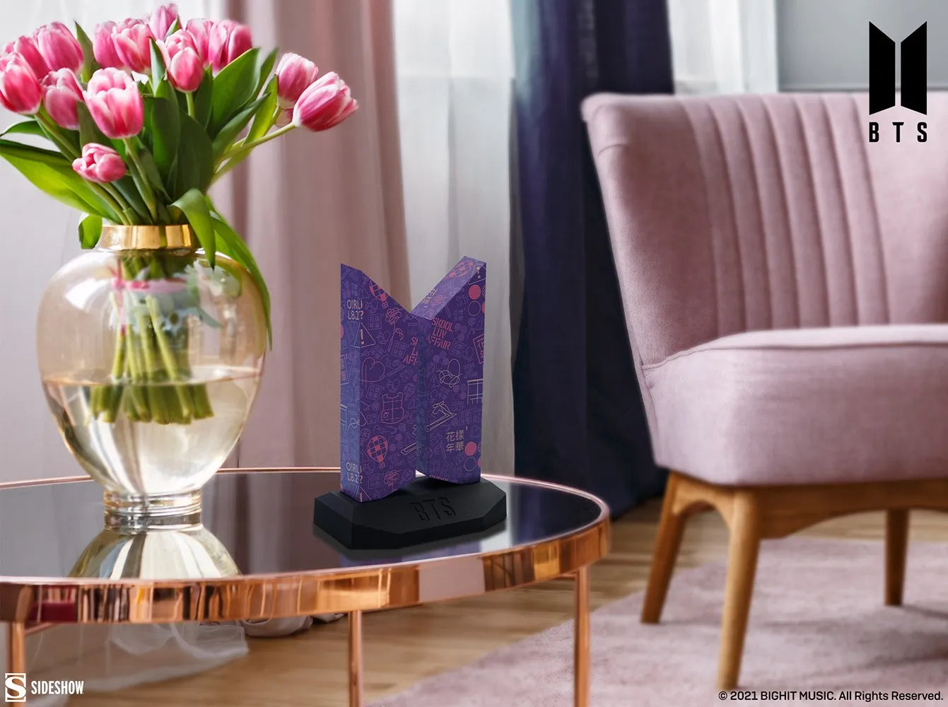 O Logo Premium BTS: 7 With You também apresenta o símbolo do ARMY em um dos lados da estátua. Os símbolos coexistem em harmonia, unindo passado e presente em um design elegante.