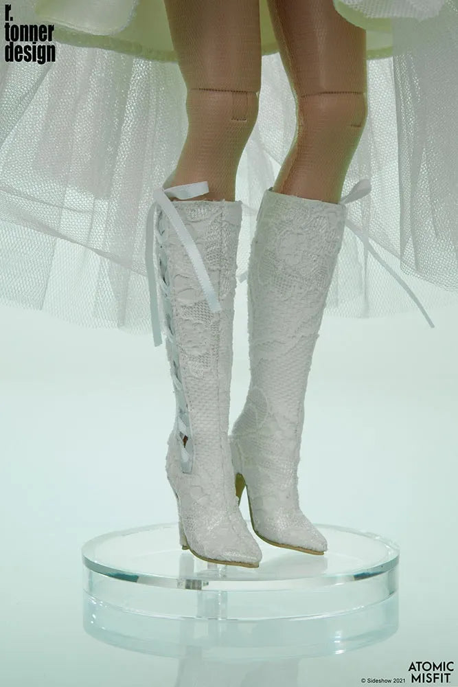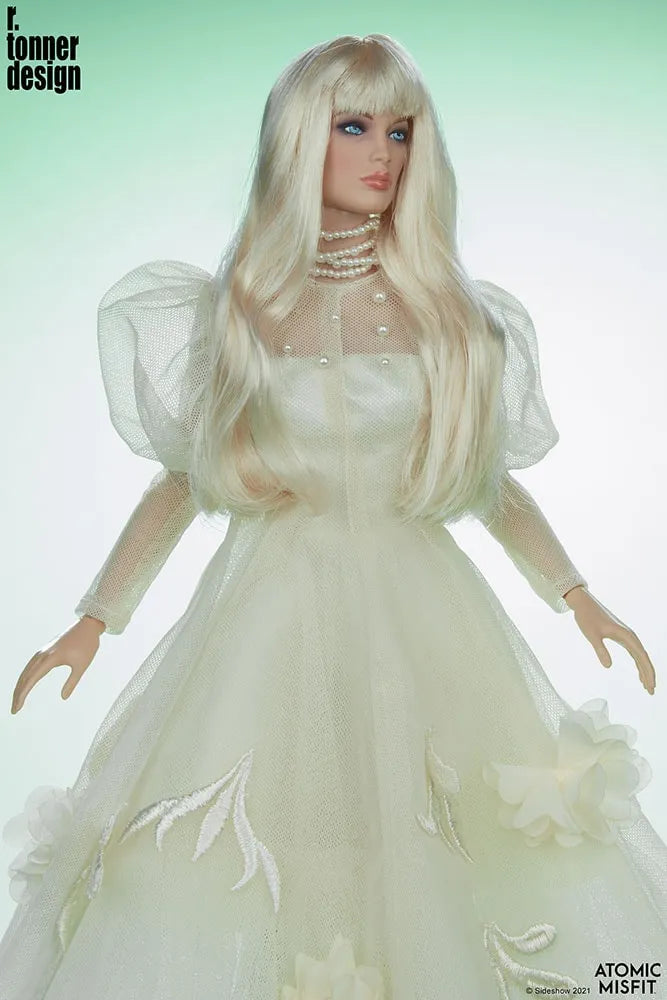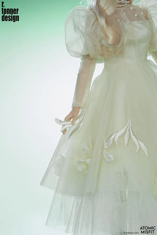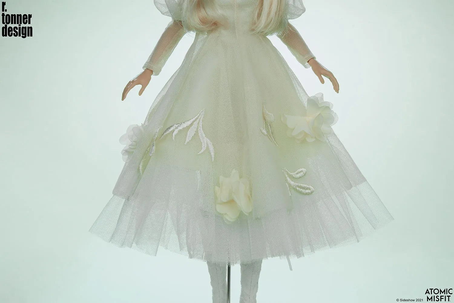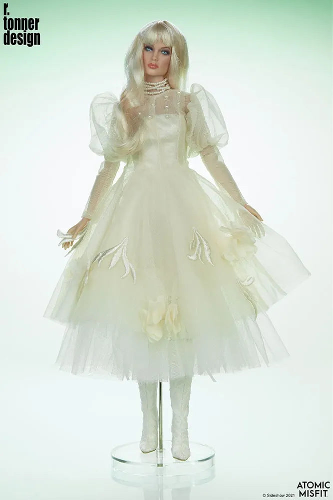 Esta beleza encantadora certamente vai chamar a atenção em qualquer gala da alta sociedade, deixando lordes e damas esperando para ter outro vislumbre de seu conjunto etéreo. Todos os olhares estão em Moiré enquanto ela encanta as multidões e atrai a atenção de um nobre cavalheiro ansioso para conhecê-la. A boneca de moda Romantic Notion apresenta uma escultura de retrato única com cabelo loiro e uma aplicação de maquiagem modesta para destacar suas lindas feições, incluindo olhos esfumados, um leve rubor e lábios rosa suave. Seu traje feito à mão, idealizado pelo próprio Tonner, inclui um vestido creme de mangas longas com detalhes florais e bordados na saia. O decote deste incrível vestido de fantasia apresenta um colar semelhante a pérolas e detalhes adicionais de contas, e um par alto de botas de renda branca completa o visual fantasioso. Nada de fadas madrinhas por aqui — apenas um olhar notável para a moda de fantasia.