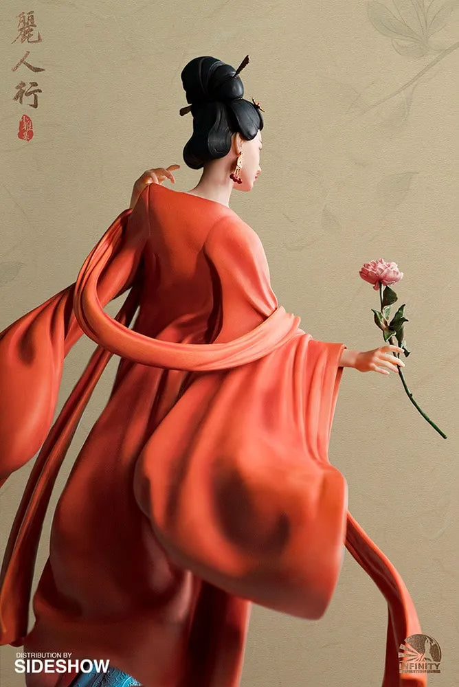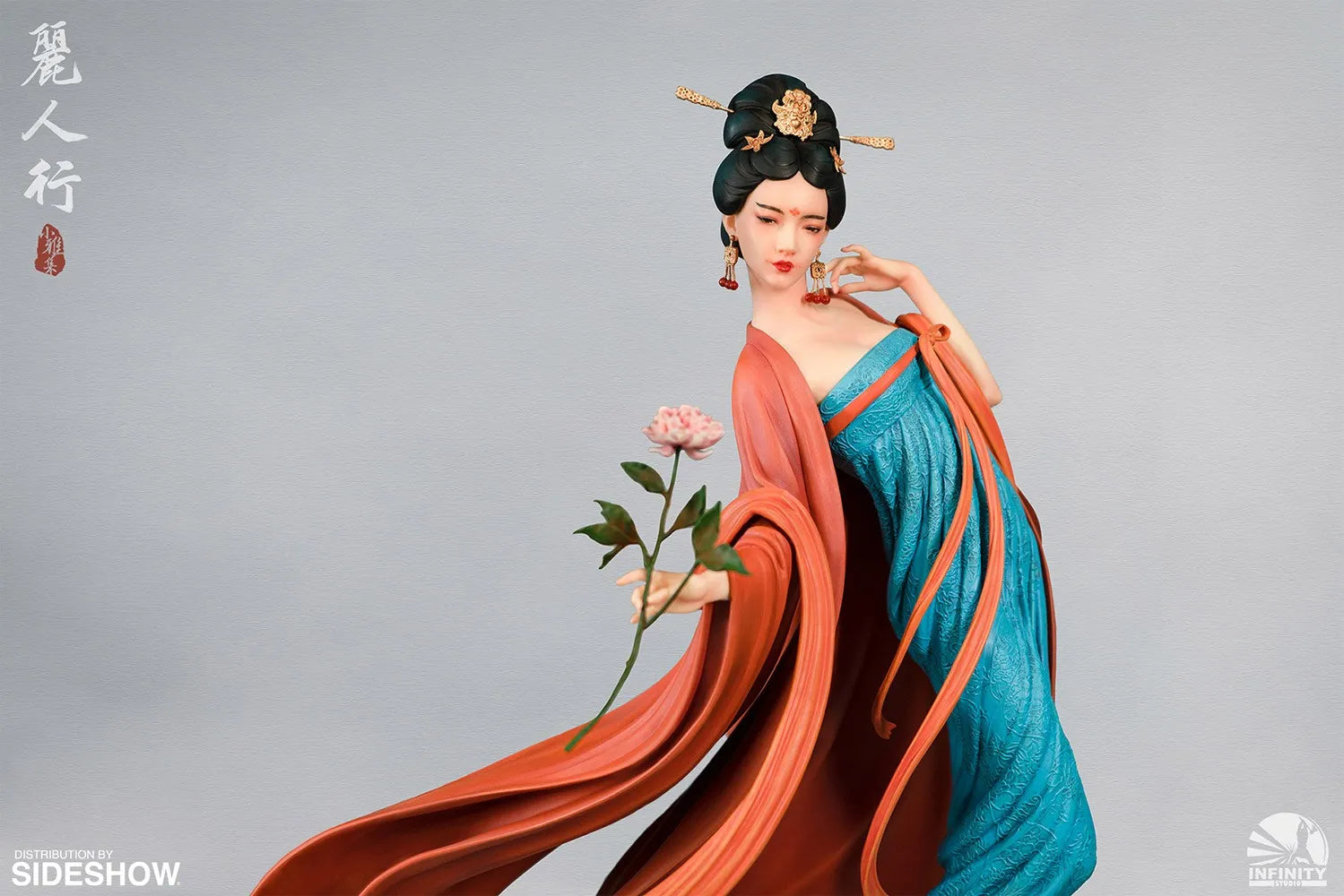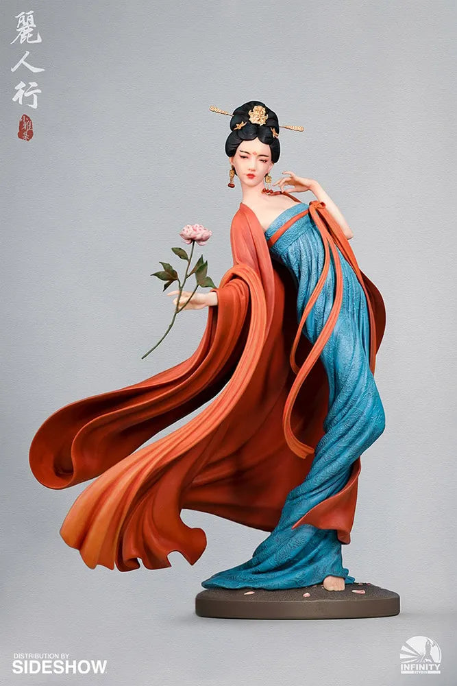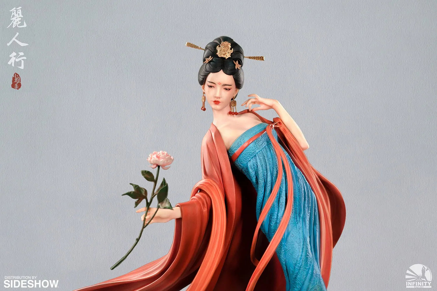Sátira da Bela Dama é o segundo produto da Série Beleza Elegante, projetado por um dos fundadores, Rocky L. Esta é uma beleza que caminha ao lado da água segurando uma peônia na mão e andando com passos divididos cheios de uma sensação estética etérea e elegante. Infinity Studio Esta estátua foi inspirada na pintura Beleza Usando Flores e na dança Sátira da Bela Dama, Rocky L recriou as linhas abstratas do tecido na pintura clássica de figuras. A base com efeito de água transparente foi inspirada por uma das Sátiras da Bela Dama de Du Fu. O tempo está bom no terceiro mês, no terceiro dia, à beira do rio tantas belezas em desfile.