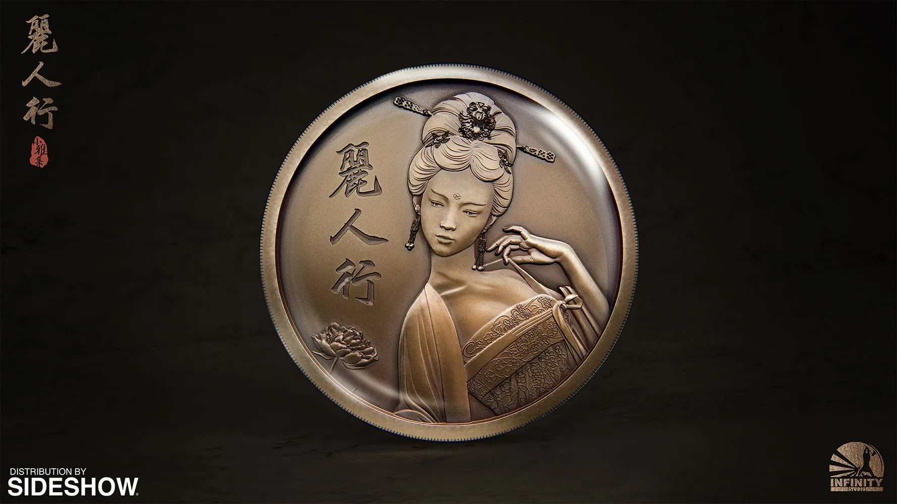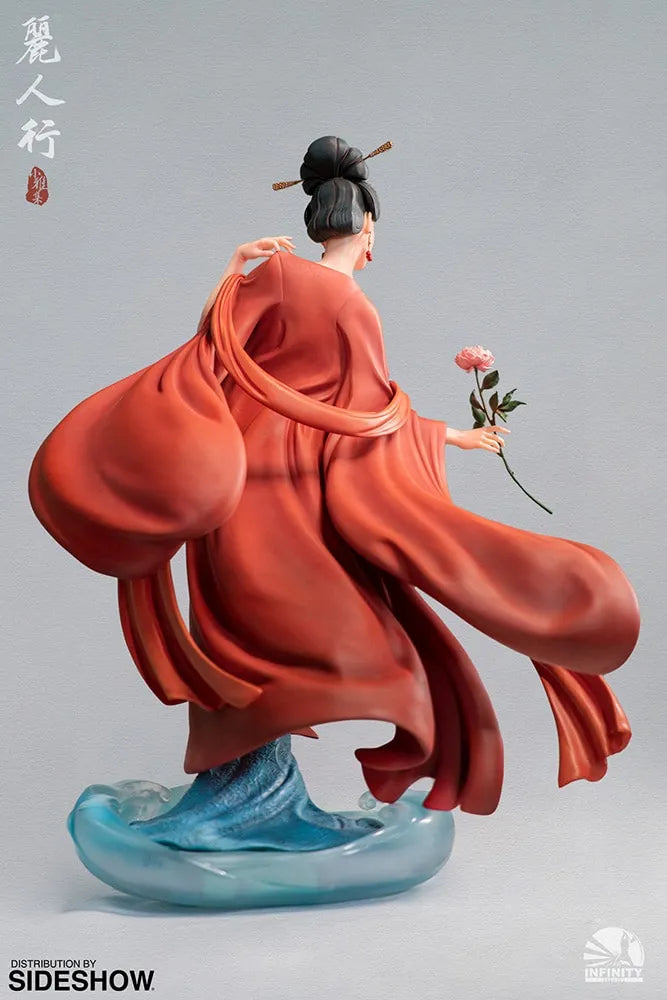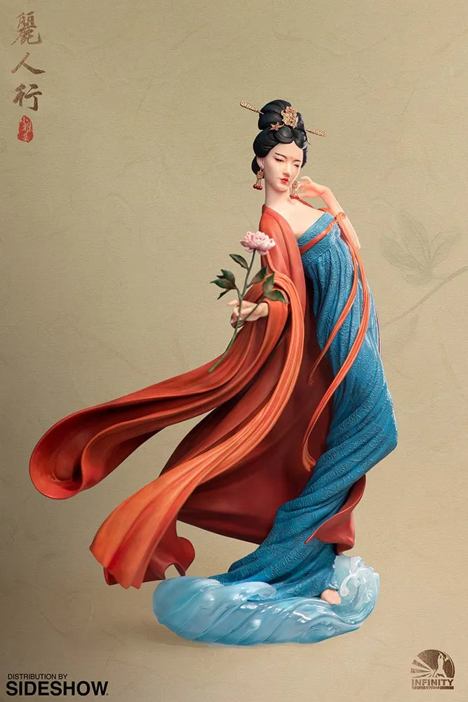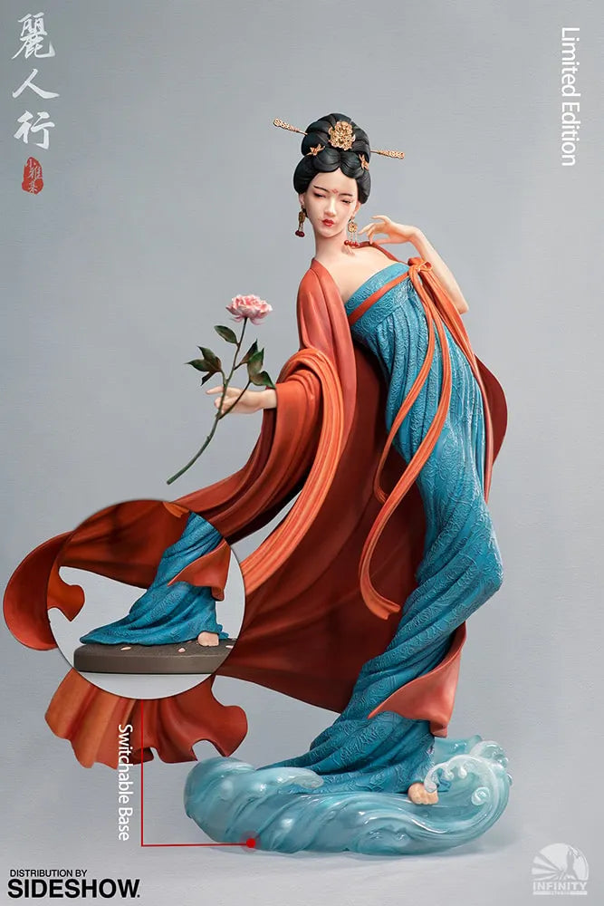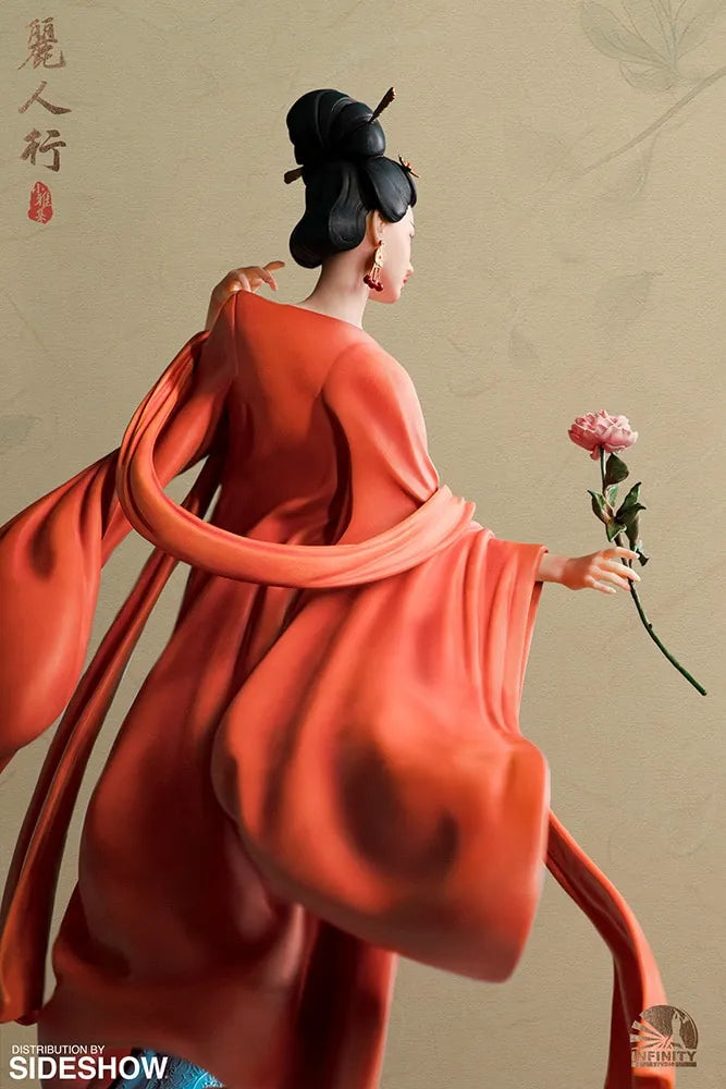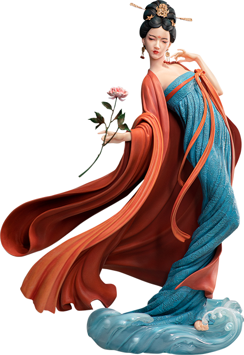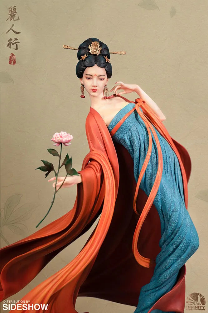 Sátira da Bela Dama é o segundo produto da Série Beleza Elegante, projetado por um dos fundadores, Rocky L. Esta é uma beleza que caminha ao lado da água segurando uma peônia na mão e andando com passos divididos cheios de uma sensação estética etérea e elegante. Infinity Studio Esta estátua foi inspirada na pintura Beleza Usando Flores e na dança Sátira da Bela Dama, Rocky L recriou as linhas abstratas do tecido na pintura clássica de figuras. A base com efeito de água transparente foi inspirada por uma das Sátiras da Bela Dama de Du Fu. O tempo está bom no terceiro mês, no terceiro dia, à beira do rio tantas belezas em desfile.