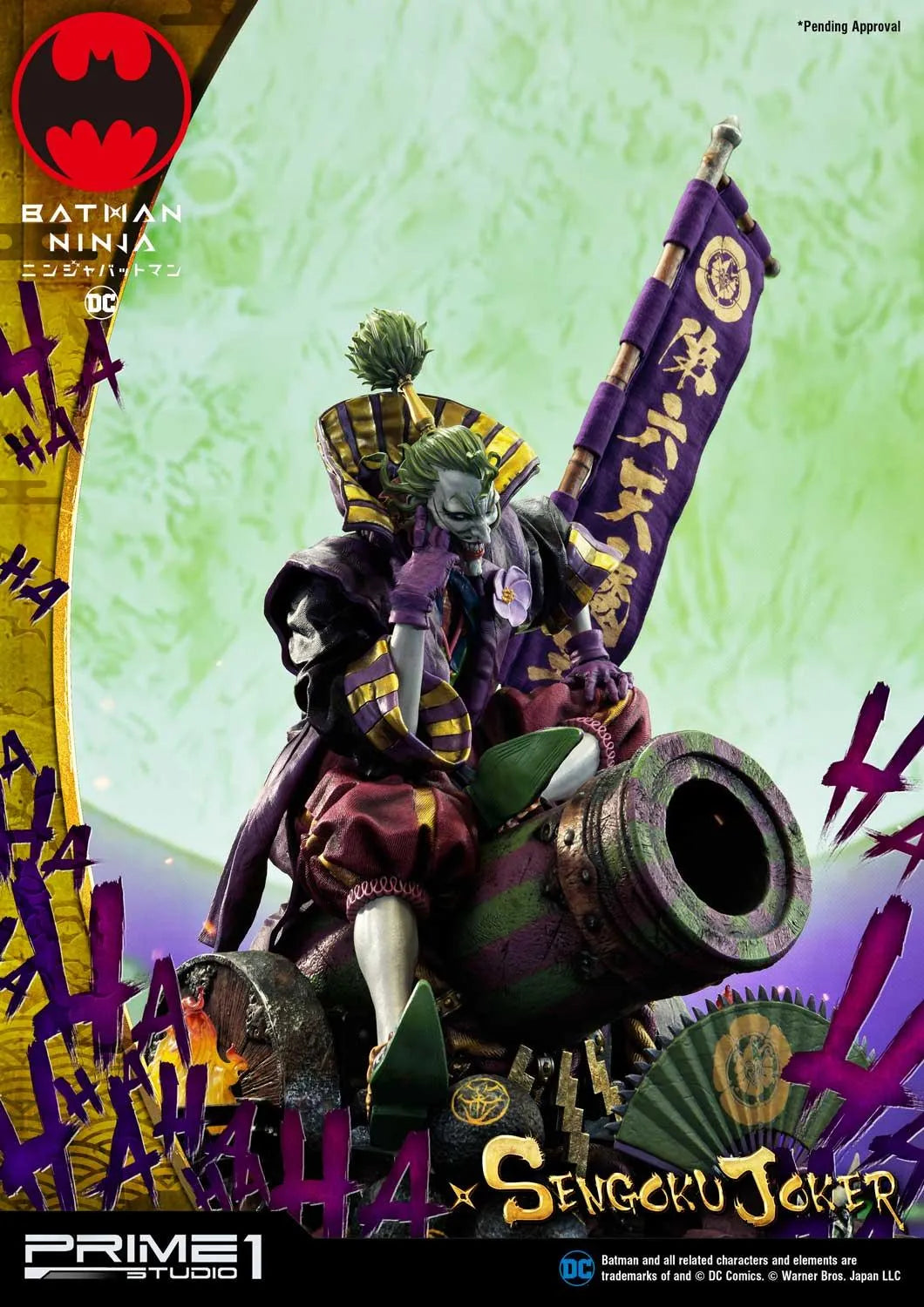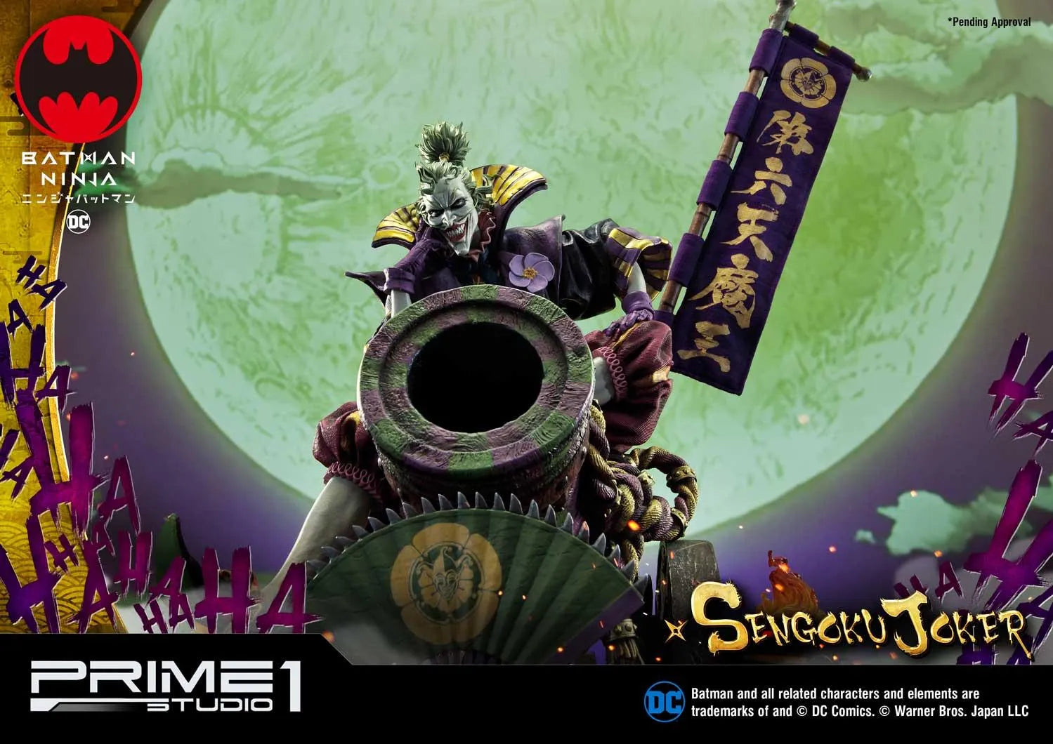 A estátua é inspirada no impressionante design de Takashi Okazaki que ele criou para a Animação Batman Ninja. Ela é feita com grande atenção aos detalhes. Também acreditamos que captura perfeitamente a atmosfera do Japão feudal e as características do Coringa. As palavras na bandeira dizem: Rei Demônio do Sexto Céu (Dairokuten-No-Mao/ 第六天の魔王), que é um Rei Demônio do Budismo.