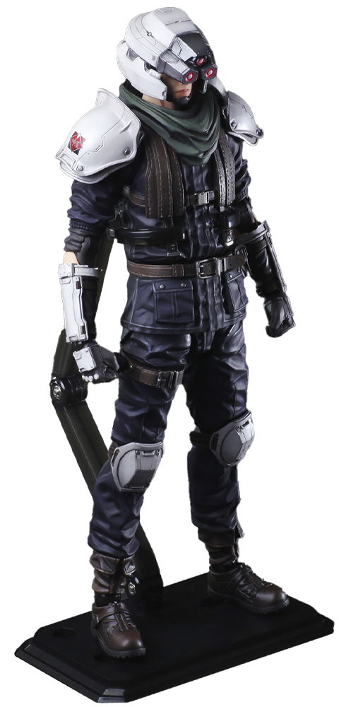 Cada detalhe; desde o visual um tanto assustador realçado pelo capacete de três visores regulamentado pela Shinra, até a textura da jaqueta, cachecol e armadura nos ombros e joelhos; representa o uniforme do oficial de segurança finamente retratado ao longo da série.