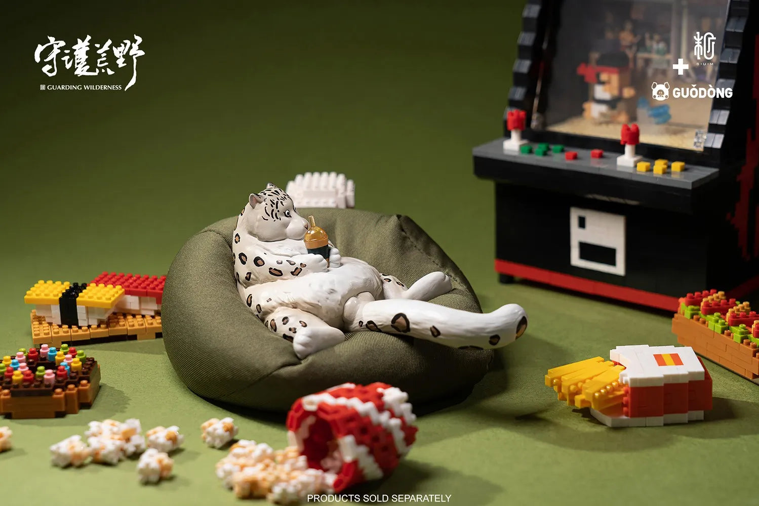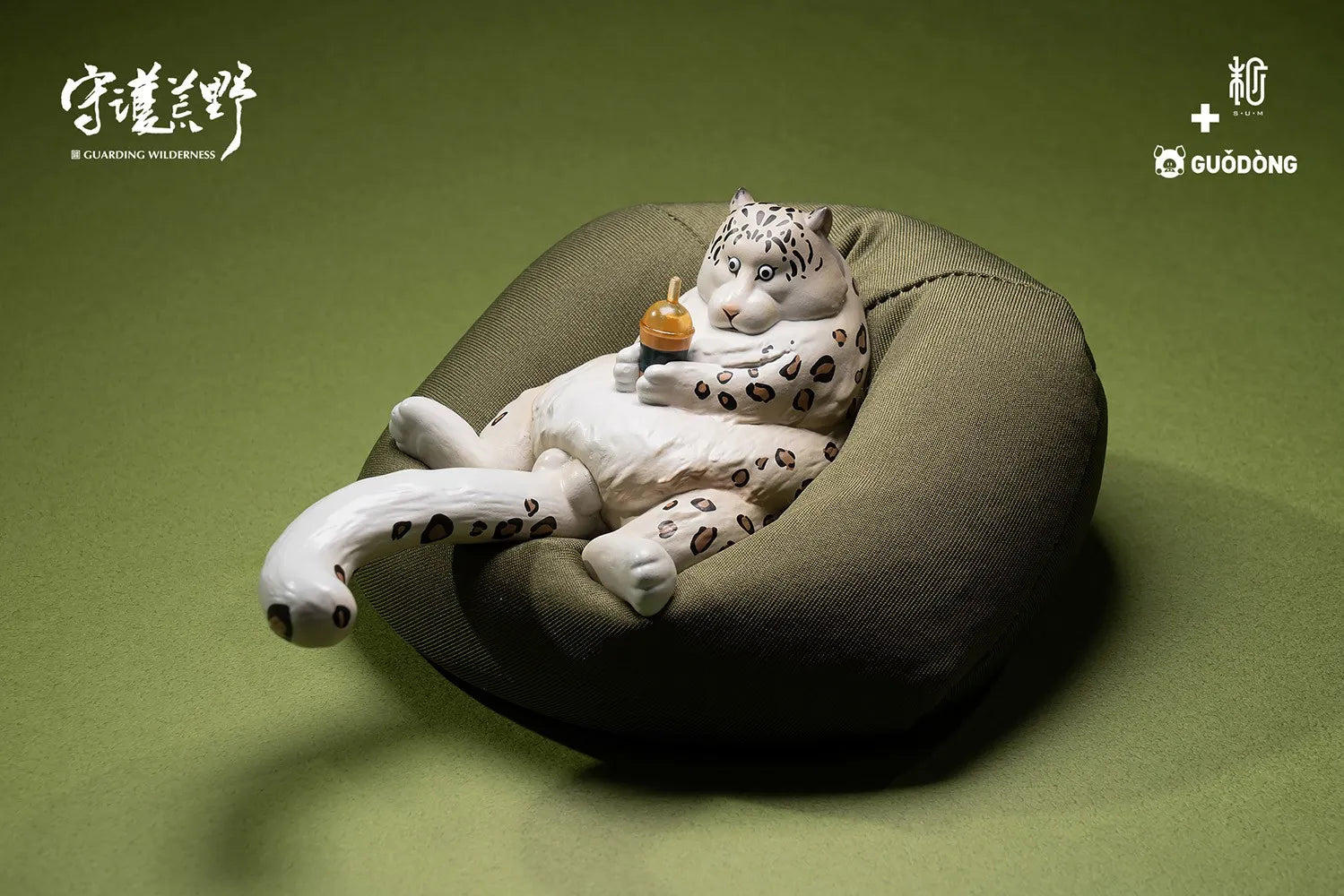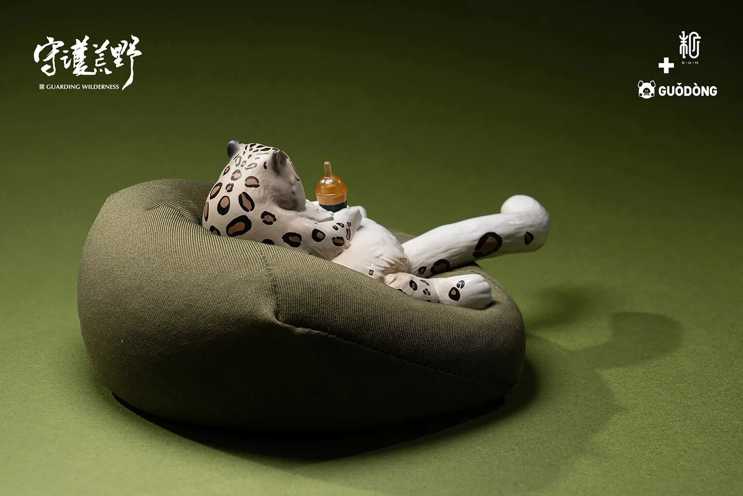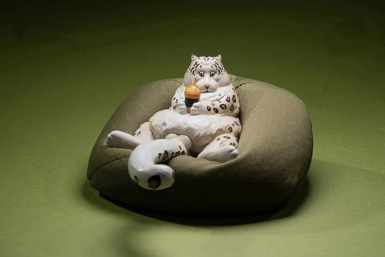 Esta estatueta de Guodong x Manas S+U+M apresenta um leopardo-das-neves em uma posição relaxada, acompanhado de um pufe e uma bebida à disposição.