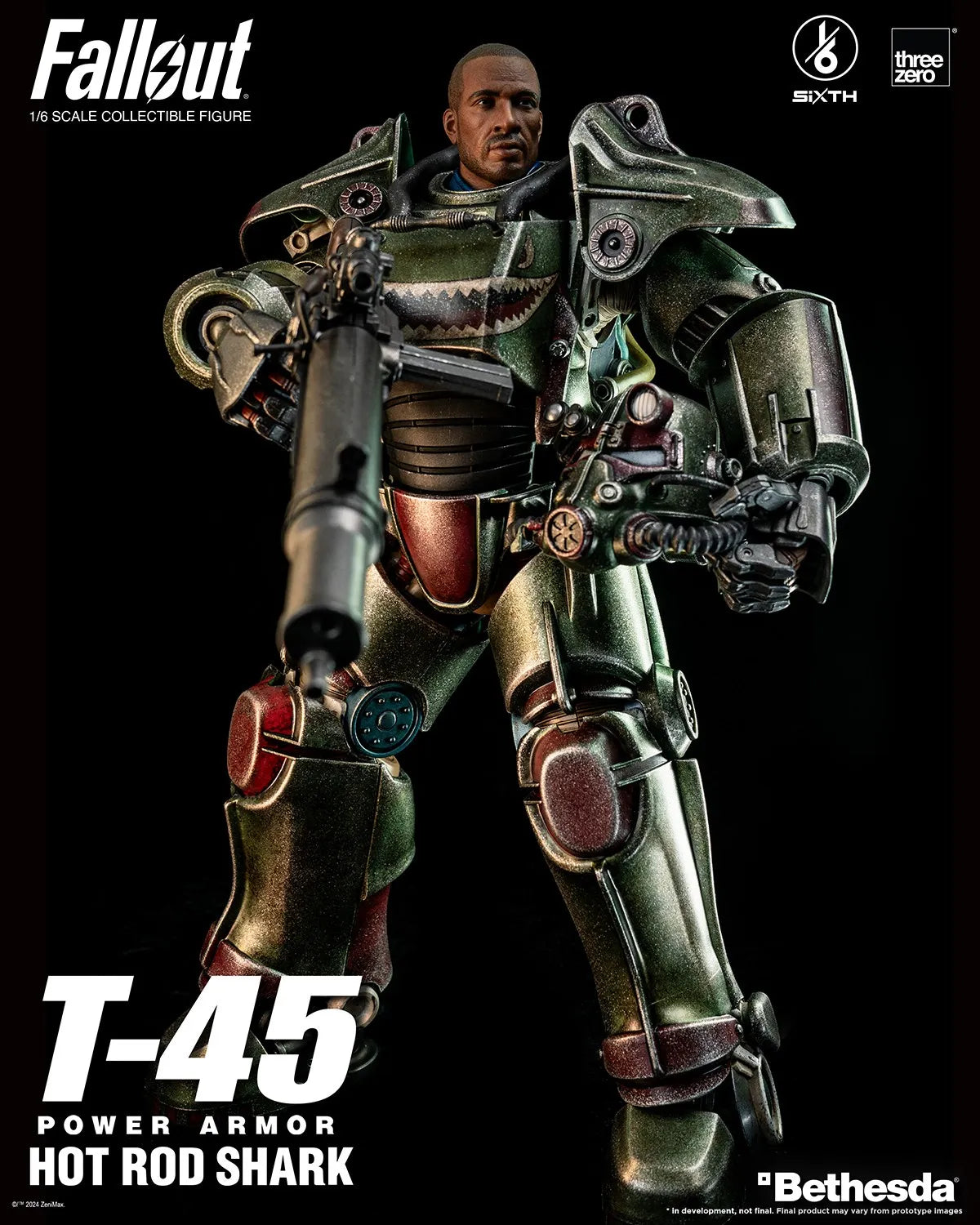 Da aclamada franquia de videogames Fallout, a threezero está mais uma vez lançando a Armadura T-45 com o popular esquema de pintura Hot Rod Shark. Pela primeira vez, a armadura Hot Rod Shark está disponível como uma figura completa com um corpo endoesquelético altamente articulado e um rifle de assalto.