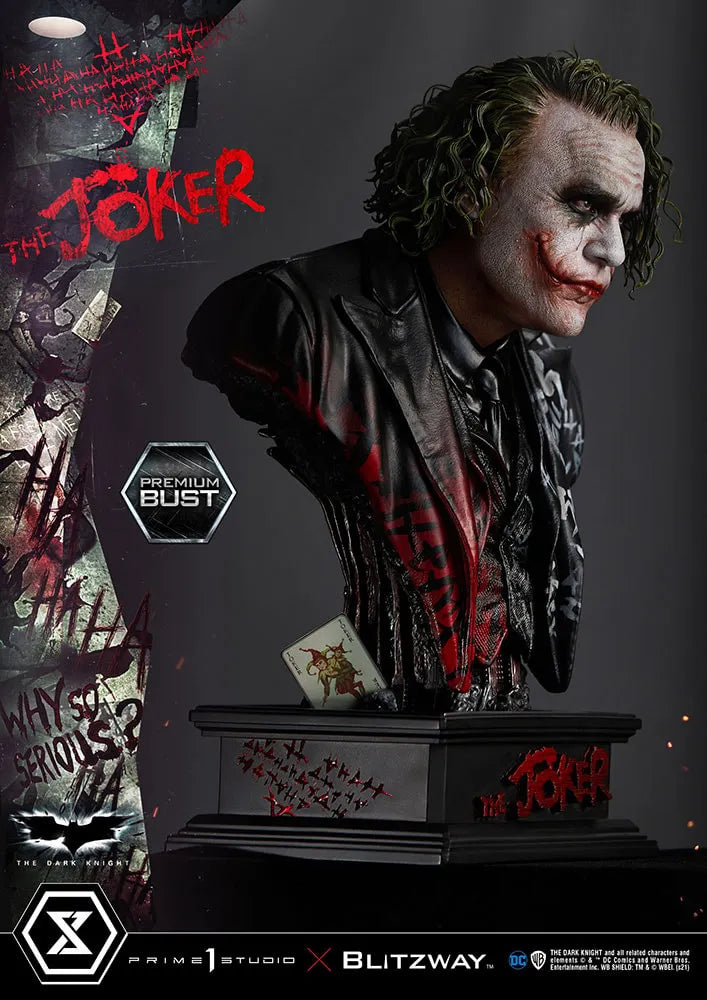 A Blitzway criou uma semelhança extremamente precisa e detalhada, cabelo realista e uma base temática de O Cavaleiro das Trevas. Além disso, este busto vem com o Cartão de Baralho de Batman Begins e o retrato do Coringa, que são compatíveis com nossa Estátua do Coringa em escala 1:3!