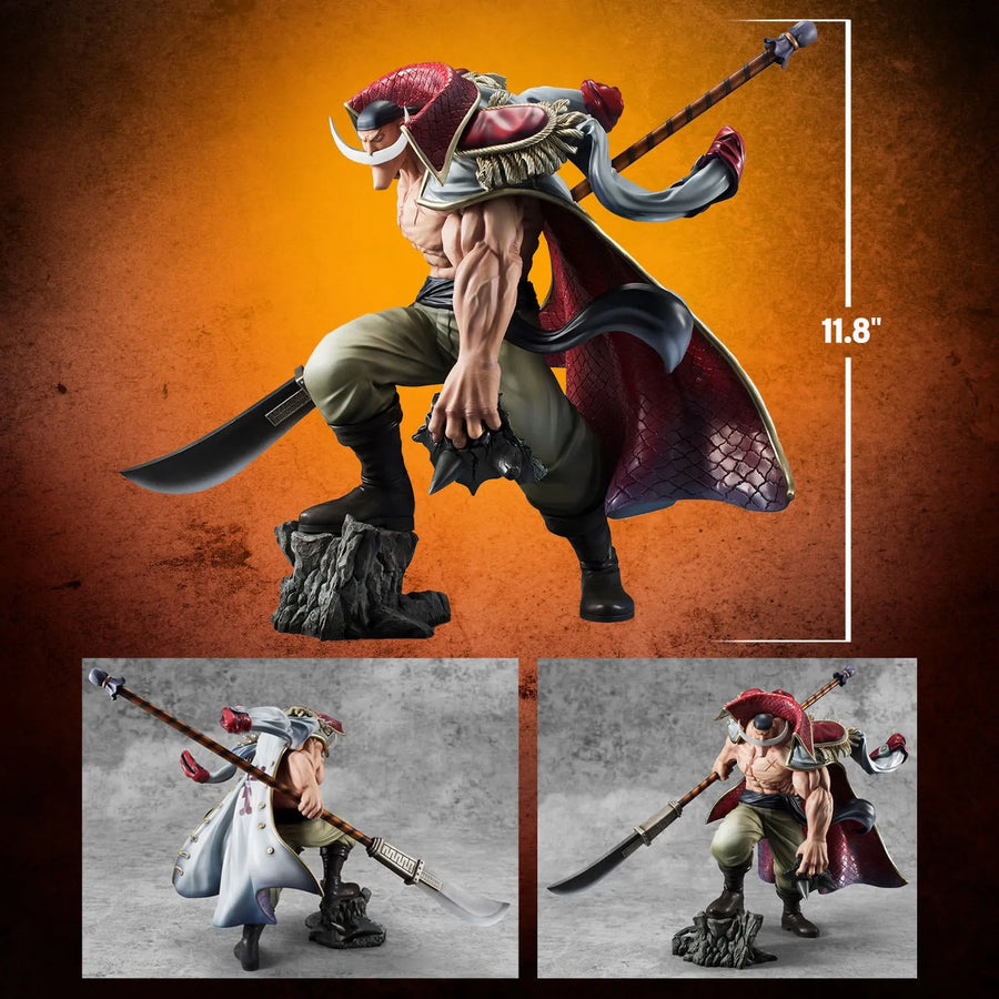 A figura é baseada em uma cena da Batalha de Marineford, onde Barba Branca foi ao resgate de Ace na Sede da Marinha para enfrentar os Sete Guerreiros do Mar, cheio de confiança e coragem!